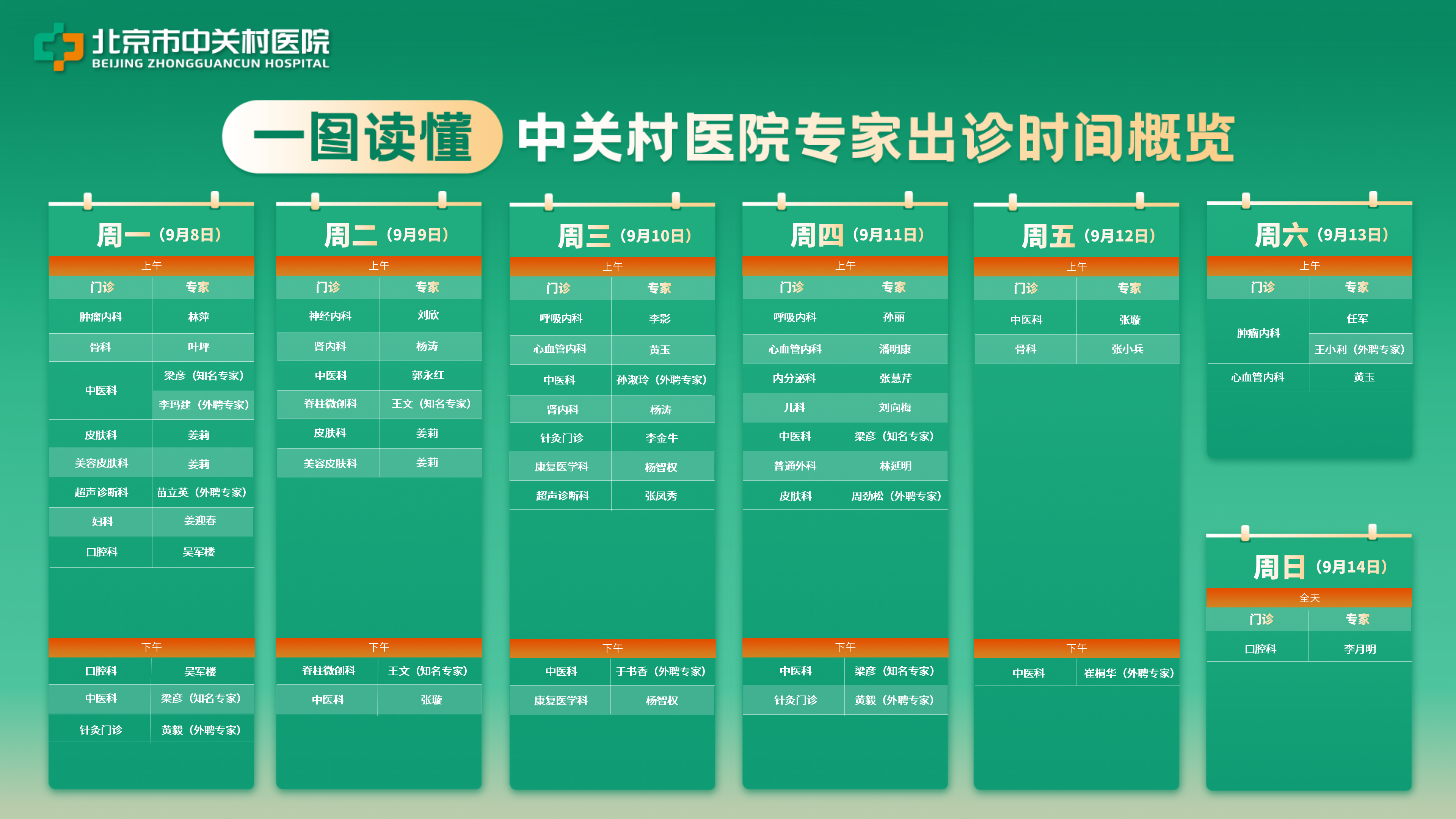 【专家出诊】9月8日至9月14日中关村医院专家出诊信息→