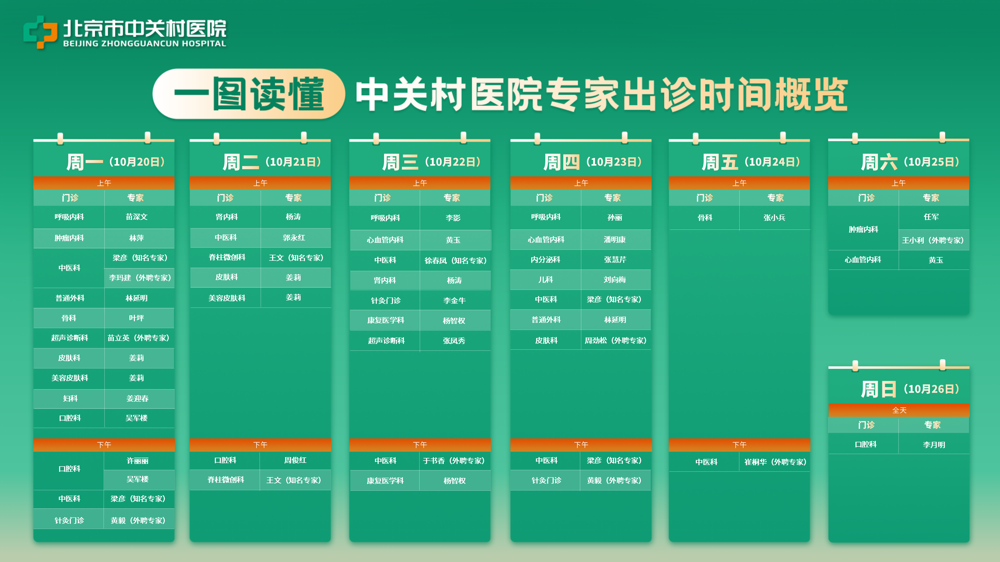 【专家出诊】10月20日至10月26日中关村医院专家出诊信息→