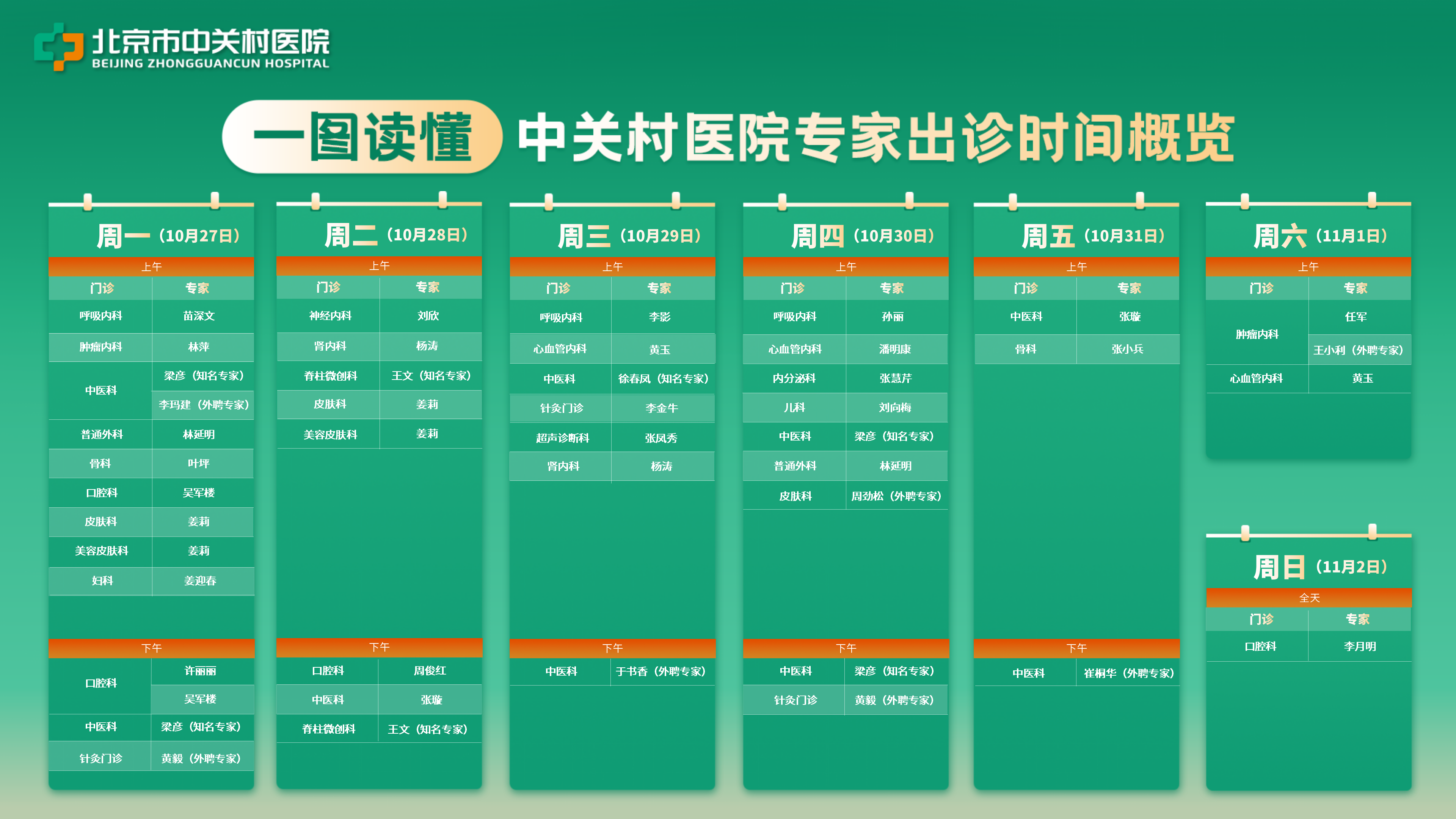 【专家出诊】10月27日至11月2日中关村医院专家出诊信息→