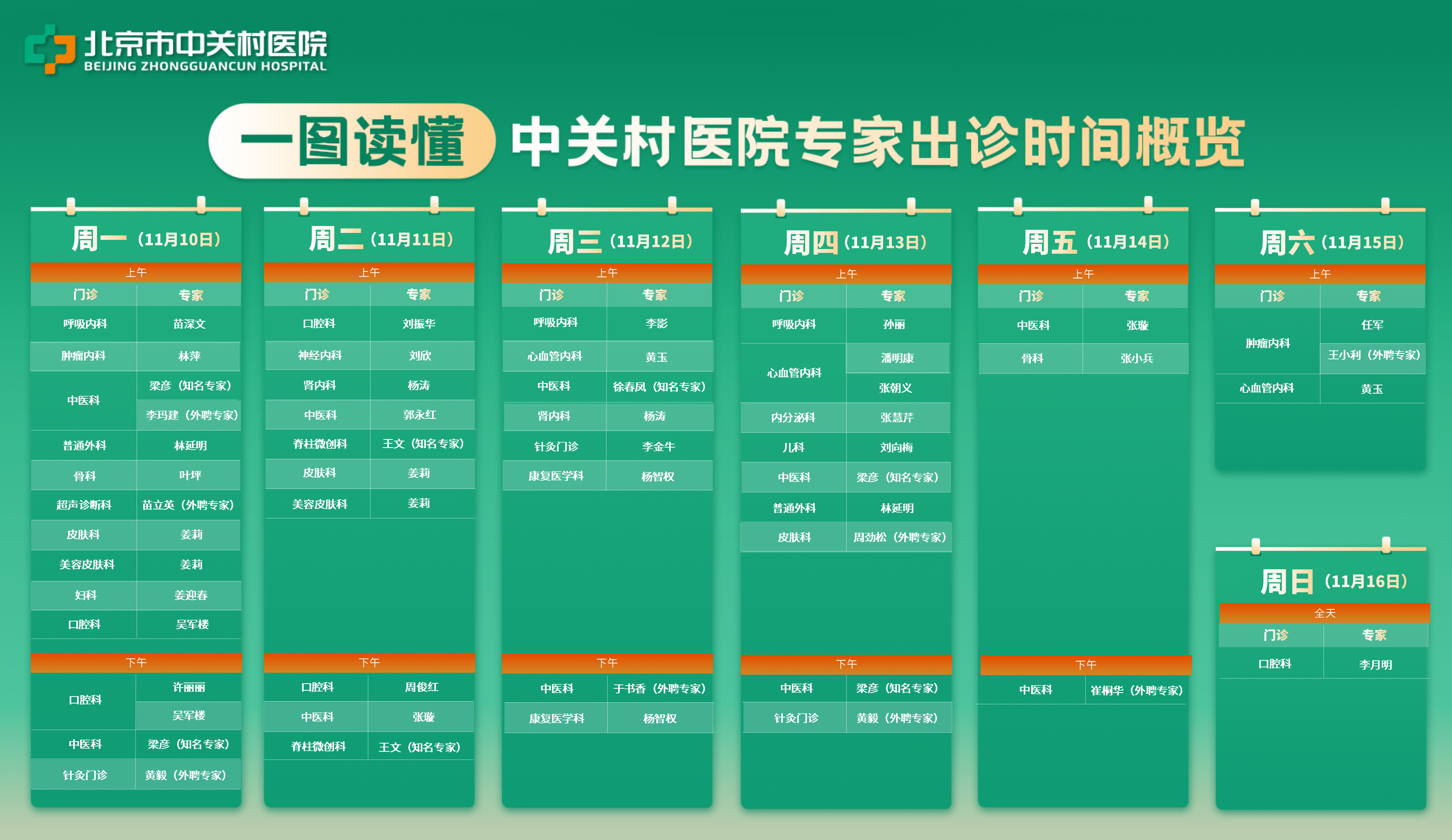 【专家出诊】11月10日至11月16日中关村医院专家出诊信息→