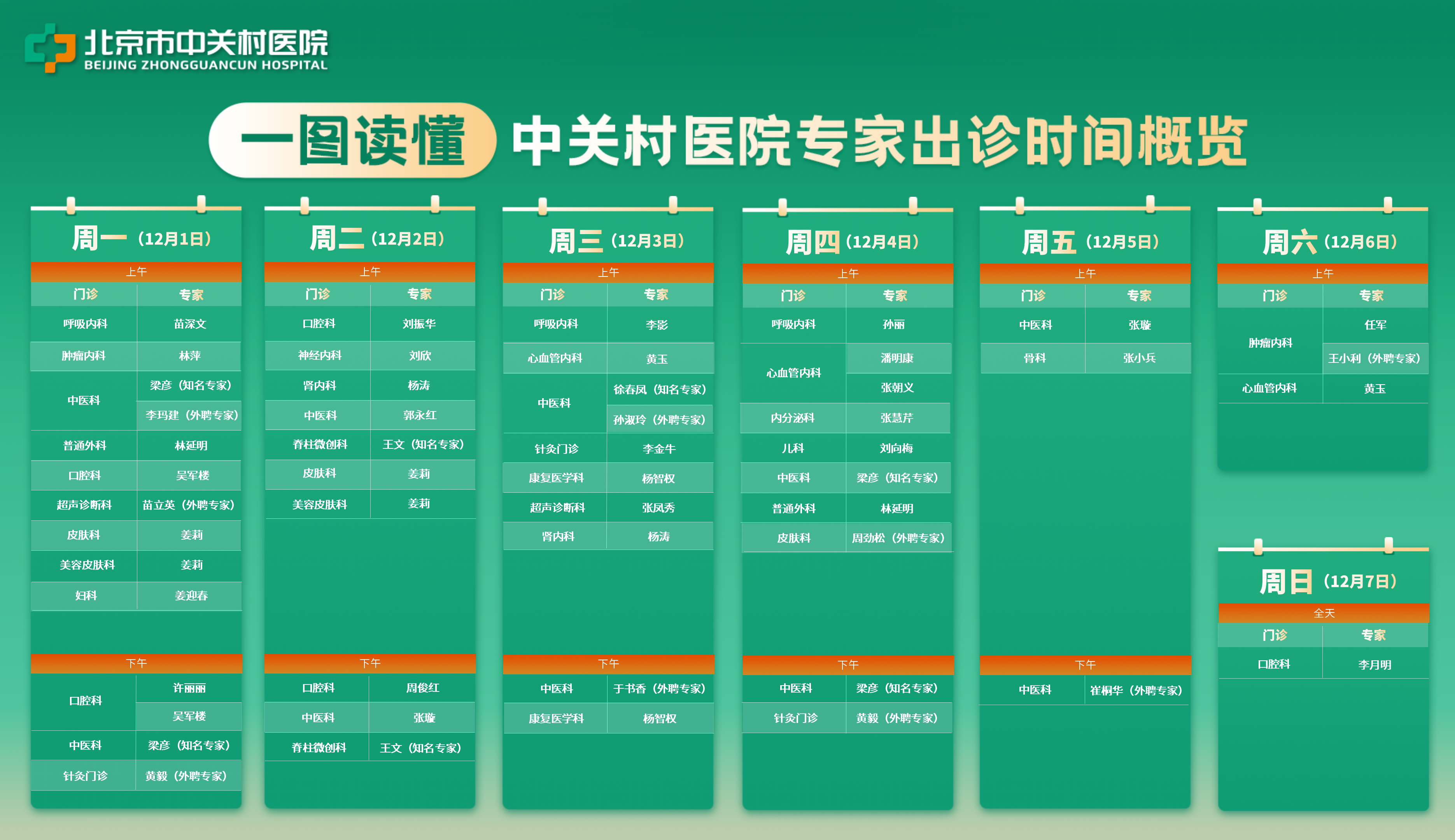 【专家出诊】12月1日至12月7日中关村医院专家出诊信息→