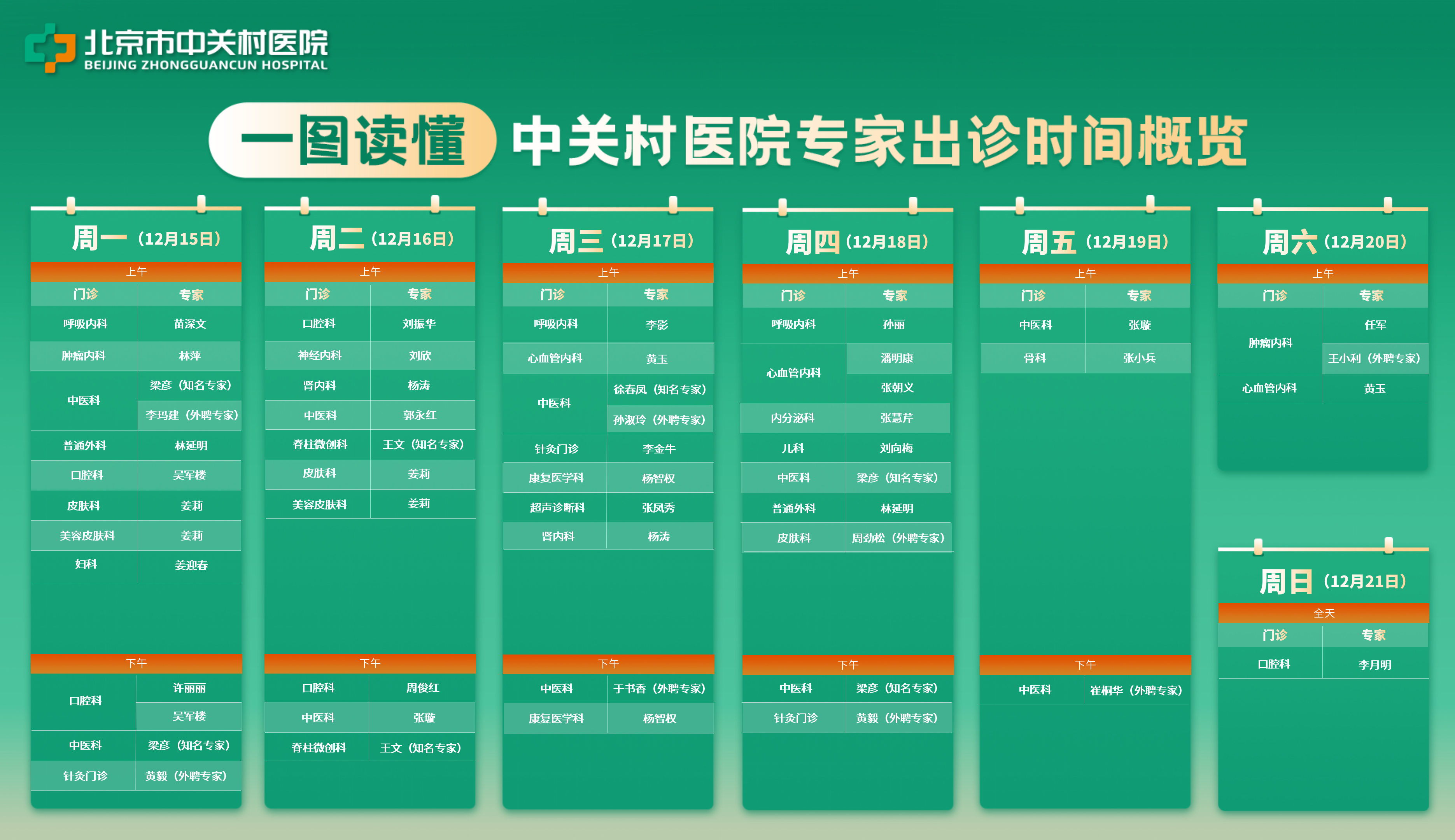 【专家出诊】12月15日至12月21日中关村医院专家出诊信息→