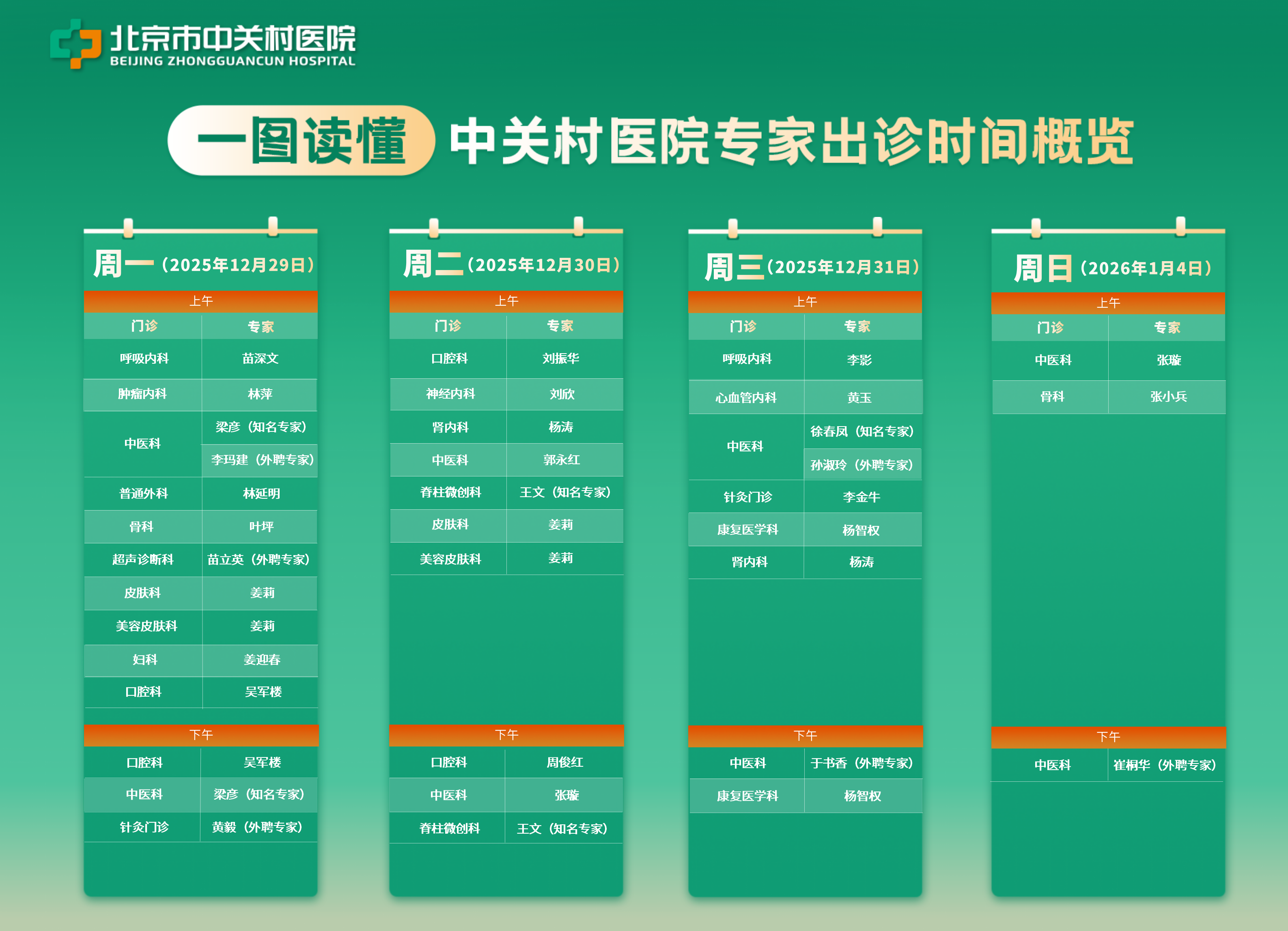 【专家出诊】2025年12月29日至2026年1月4日中关村医院专家出诊信息→