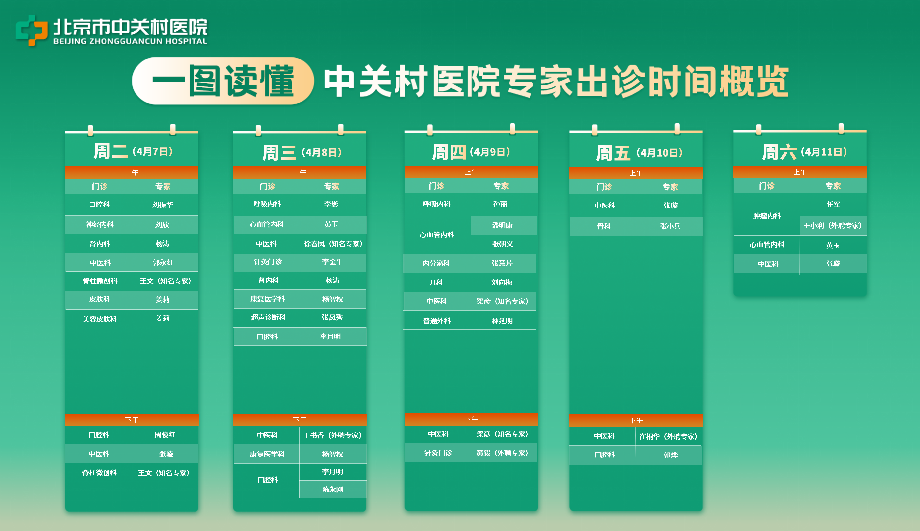 【专家出诊】4月6日至4月12日中关村医院专家出诊信息→