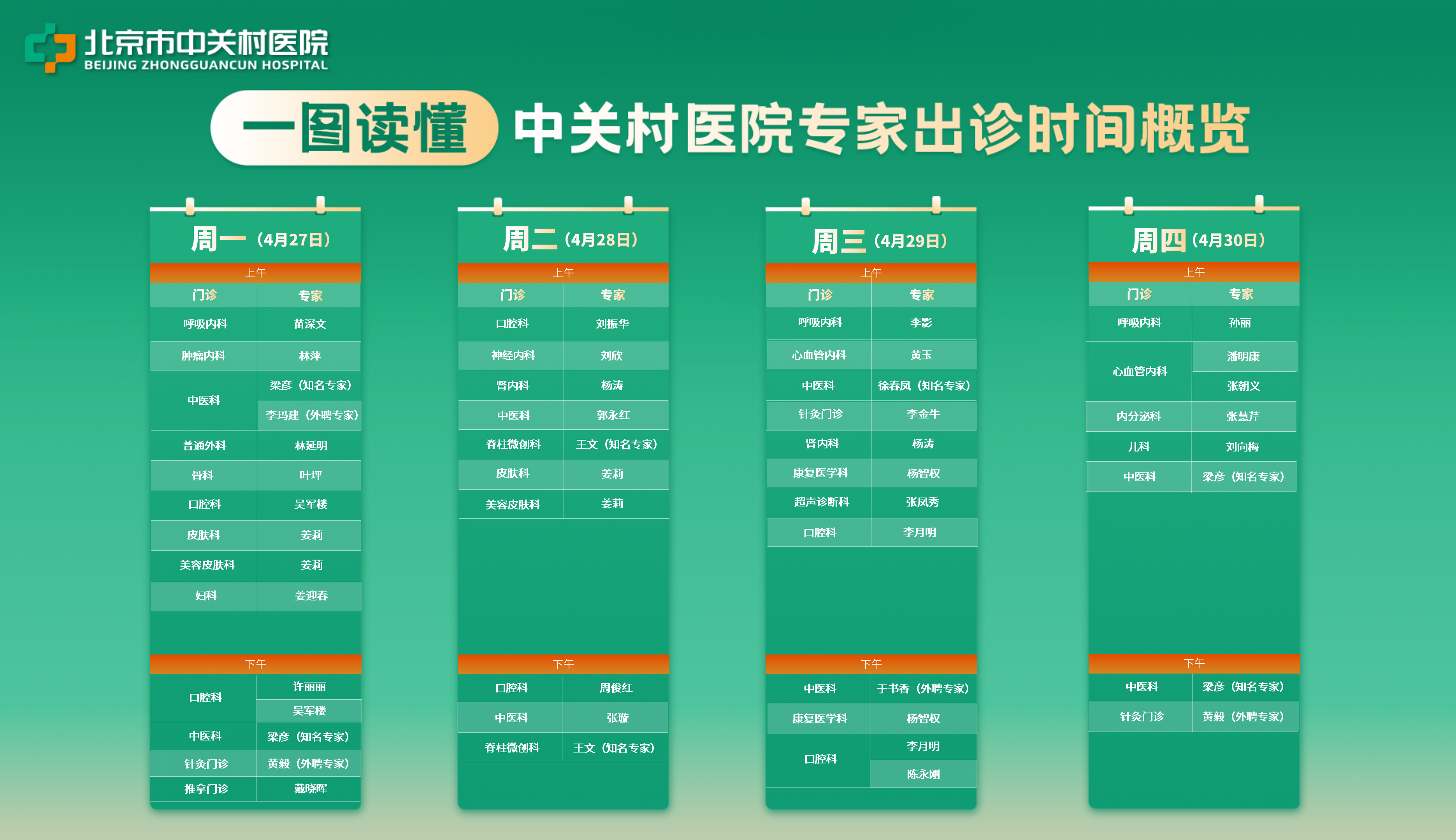 【专家出诊】4月27日至5月3日中关村医院专家出诊信息→