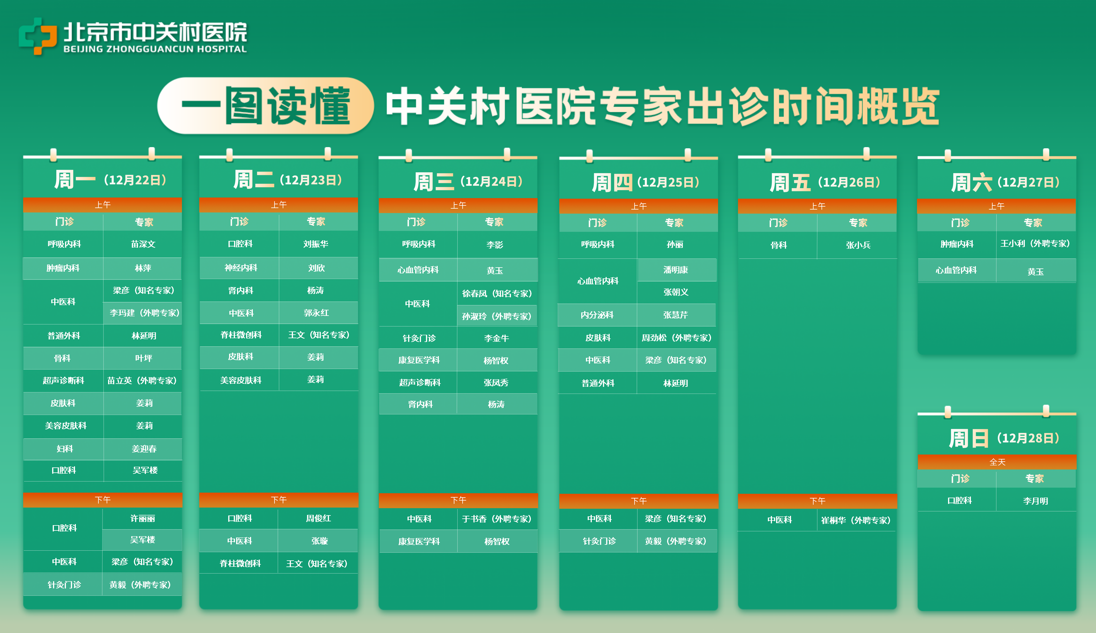 【专家出诊】12月22日至12月28日中关村医院专家出诊信息→
